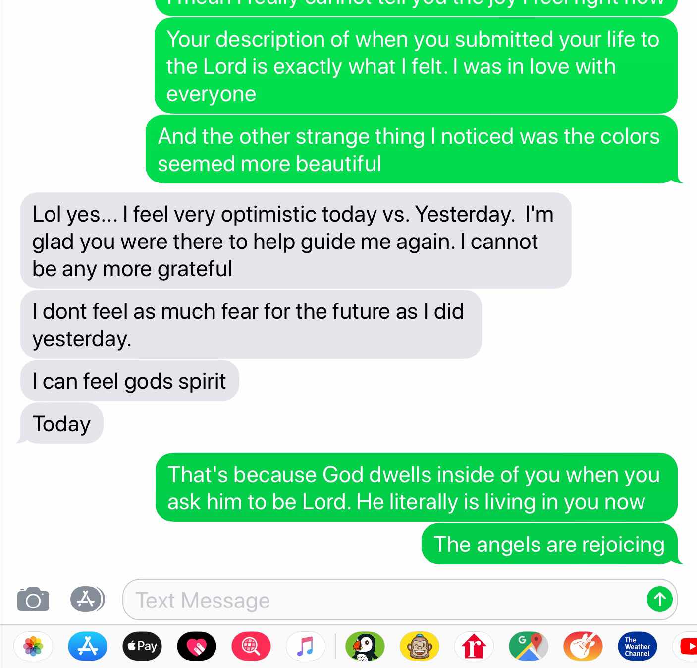 I stayed in touch, sending encouraging Bible verses that evening and the next morning. As I was driving back to the sidewalk the following day, I received this text from T. Her words are in the grey text bubbles.